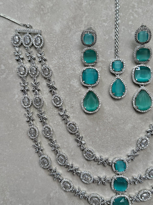 Amani Long Necklace Set - Silver/Teal (Heera Collection)
